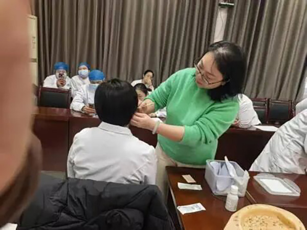 在多场次的中医适宜技术工作坊中,场面十分活跃。骨科病区护士长姜雪演示了中药水罐技术,心内科骨干护士孙亚庆演示了中药膏摩技术,老年医学科护士长徐玉新演示耳穴压丸技术。现场多名医护人员亲身体验各项技术后,均感受到了前所未有的舒适体验,随即对中医适宜技术充满兴趣并展现出极高的学习热情,积极提问、认真记录。在实践操作环节更是踊跃参与,并表示将技术要用于临床实践中。