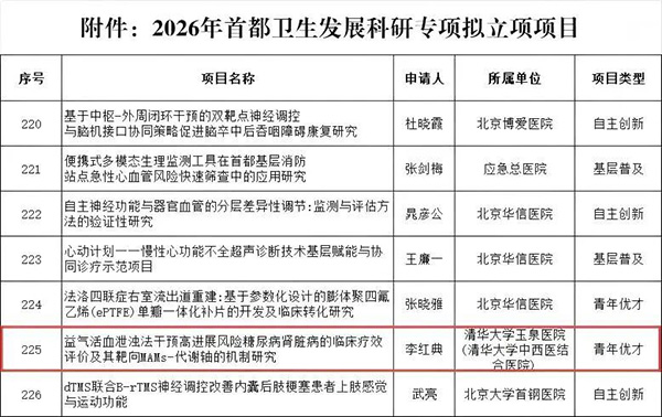 新获批首发科研项目:在最新公布的2026年首都卫生发展科研专项通知中,我院医师李红典获批“益气活血泄浊法干预高进展风险糖尿病肾脏病的临床疗效评价及其靶向MAMs-代谢轴的机制研究”青年优才项目。