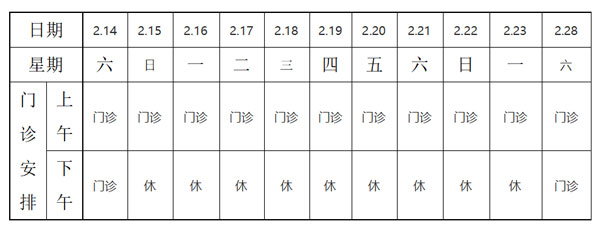 仅2月15日、22日休诊,其余时间正常出诊。